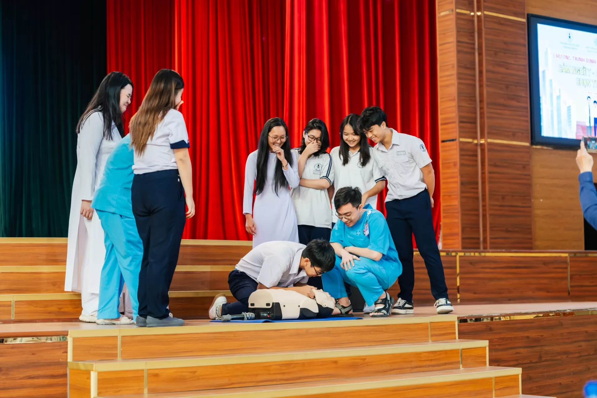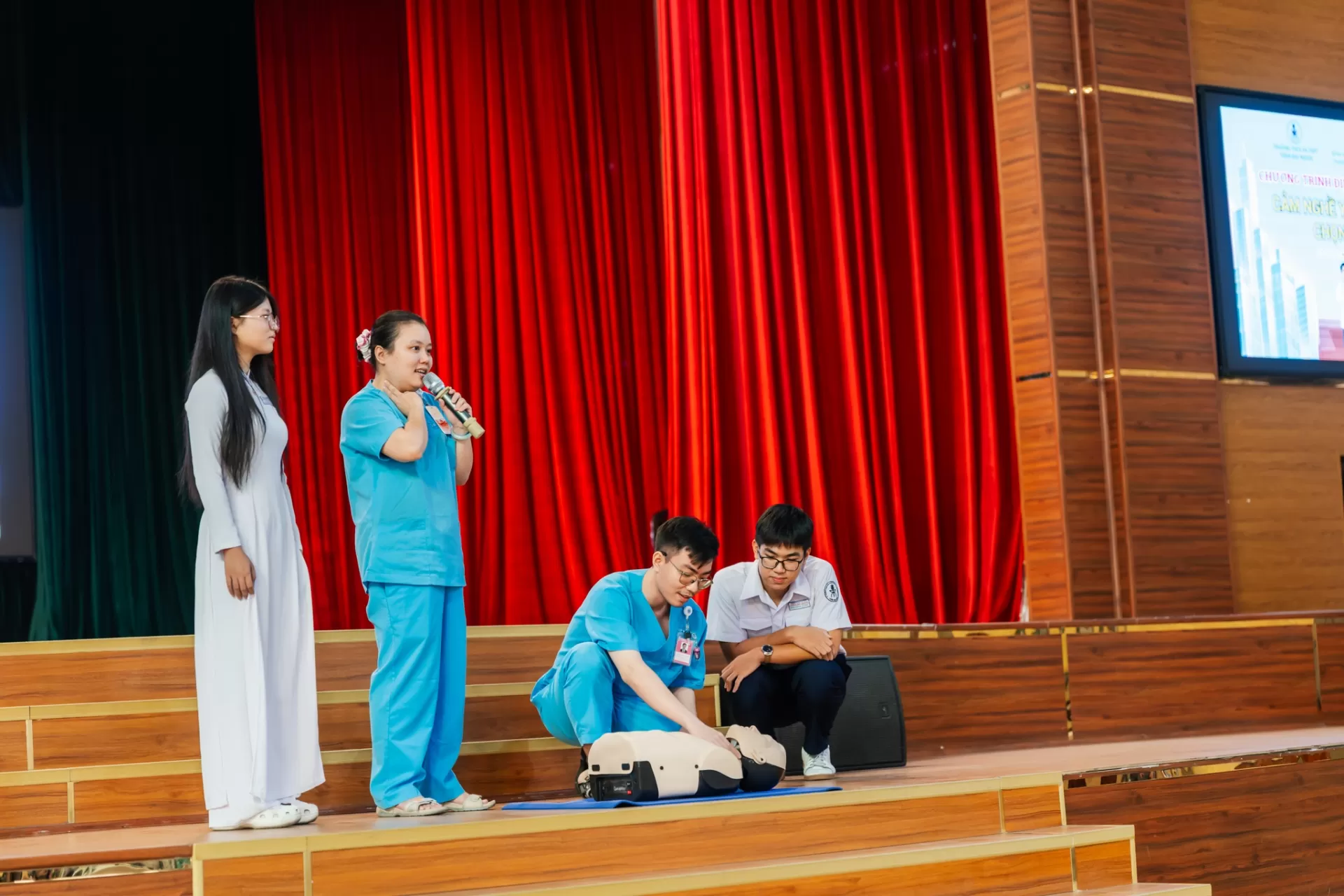 Các Cô, Chú điều dưỡng Khoa Cấp cứu đã hướng dẫn các bạn thao tác sơ cứu ban đầu và các bạn học sinh đã được thực hành trong chương trình.