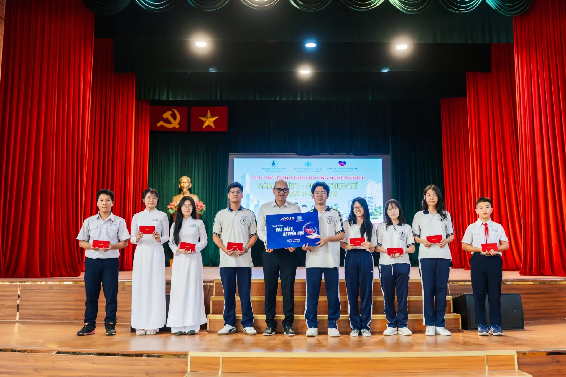 Ngoài ra, Ông Nguyễn Mạnh Quý - Giám đốc truyền thông Tập đoàn Apollo Silicone đã trao tặng 10 suất học bổng khuyến học, khuyến tài cho 10 học sinh của trường.