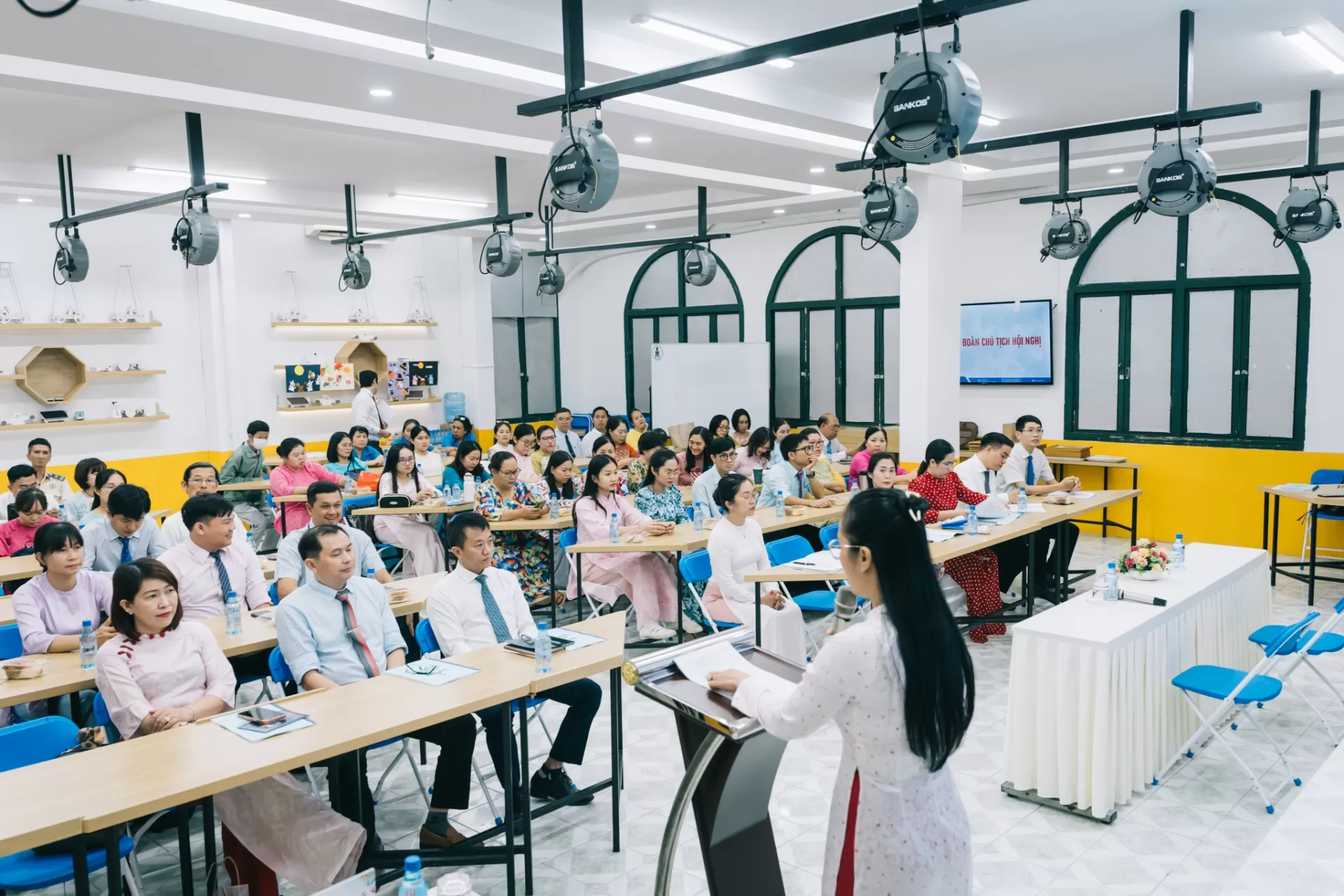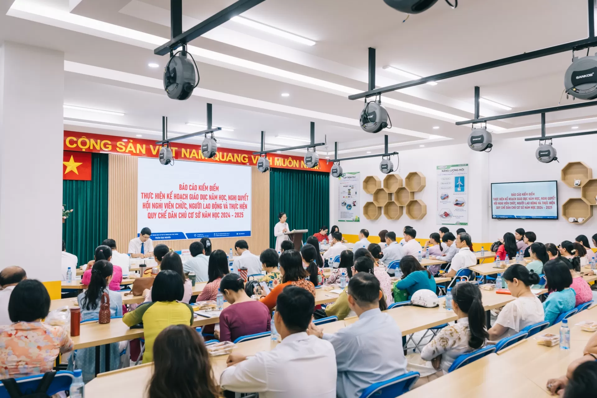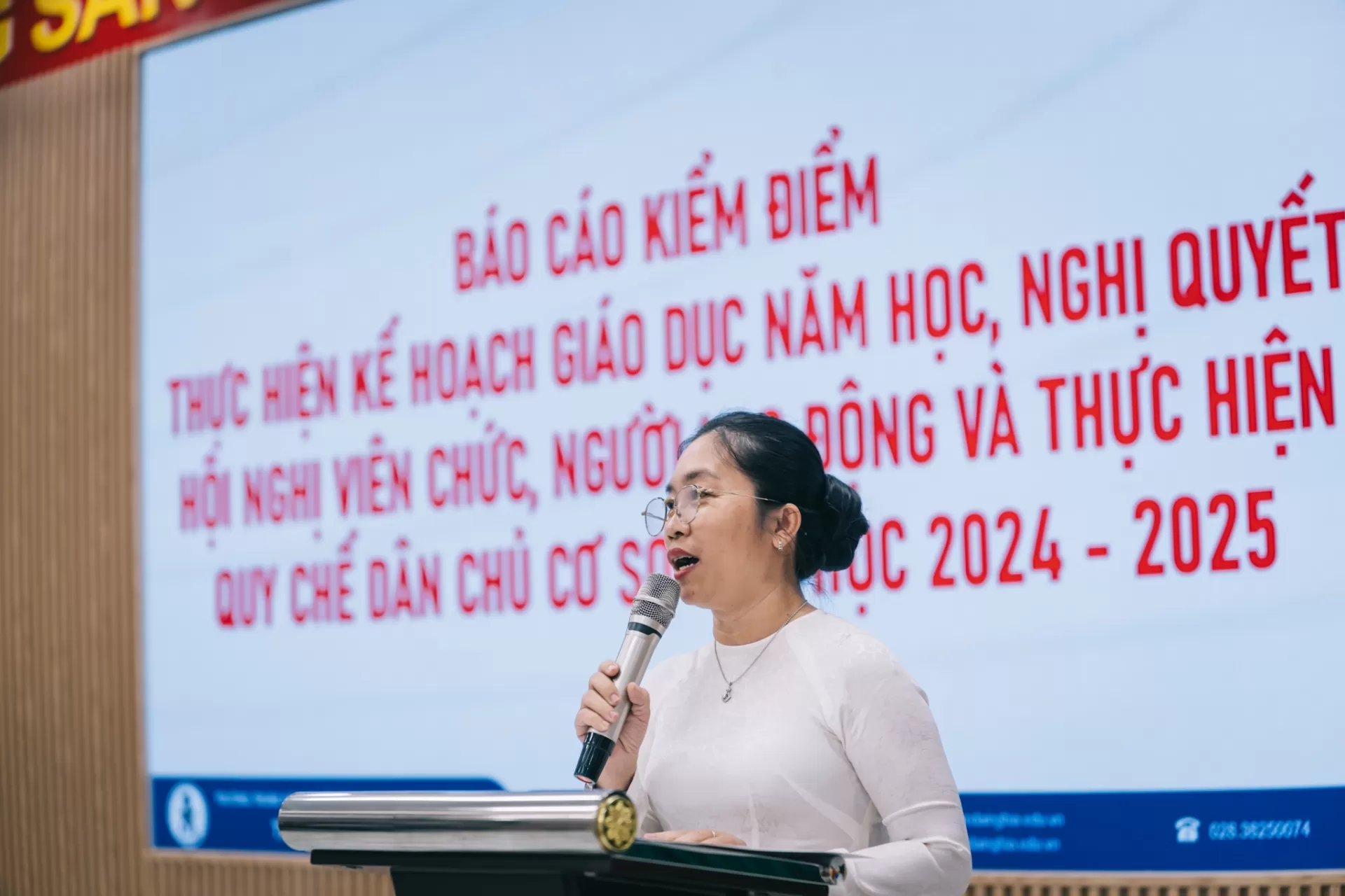 Tại Hội nghị, Cô Trần Thị Hồng Thủy, Hiệu trưởng, đã báo cáo kiểm điểm thực hiện kế hoạch giáo dục năm học, nghị quyết hội nghị viên chức, người lao động và thực hiện quy chế dân chủ cơ sở năm học 2024-2025 đồng thời triển khai phương hướng nhiệm vụ năm học 2025-2026.