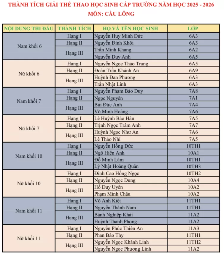 - Môn thi Cầu lông thu hút gần 130 học sinh đăng ký thi đấu ở hai nội dung đơn nam và đơn nữ của 32 lớp thuộc bốn khối: khối 6, khối 7, khối 10 và khối 11