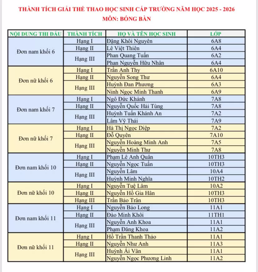 Giải thể thao học sinh cấp trường năm học 2025-2026. Môn: Bóng bàn