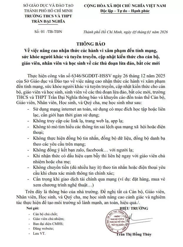 Thông báo về việc nâng cao nhận thức các hành vi xâm phạm đến tính mạng, sức khỏe người khác, các thủ đoạn lừa đảo, bắt cóc online