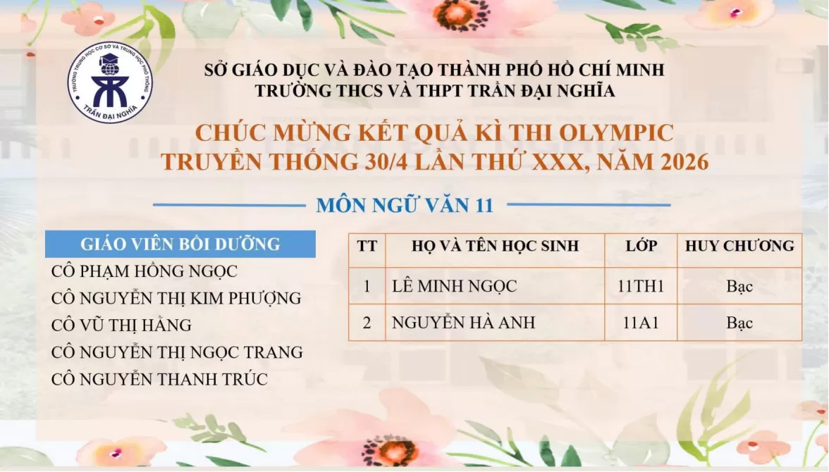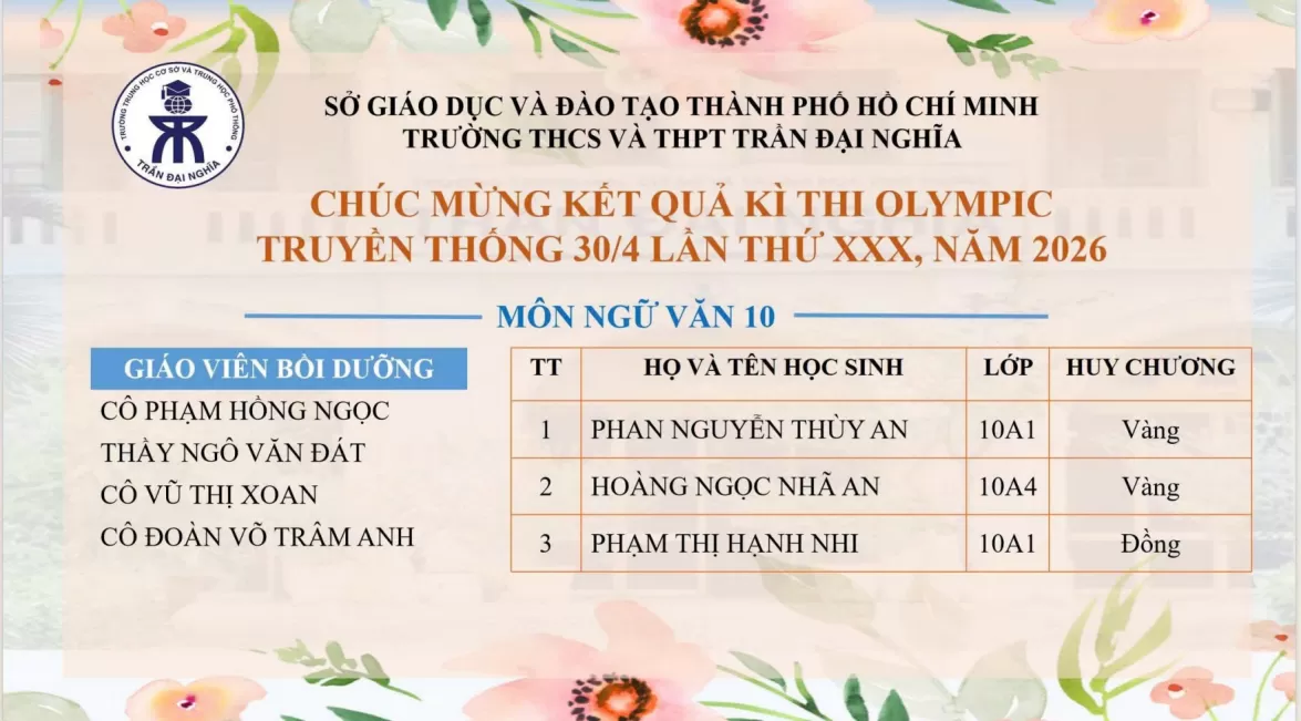 Kỳ thi Olympic 30/4 khép lại, nhưng những giá trị mà hành trình này mang lại sẽ còn lan tỏa – như một mùa hoa đẹp đã kịp nở, góp phần làm nên bức tranh rực rỡ của trường THCS và THPT Trần Đại Nghĩa.