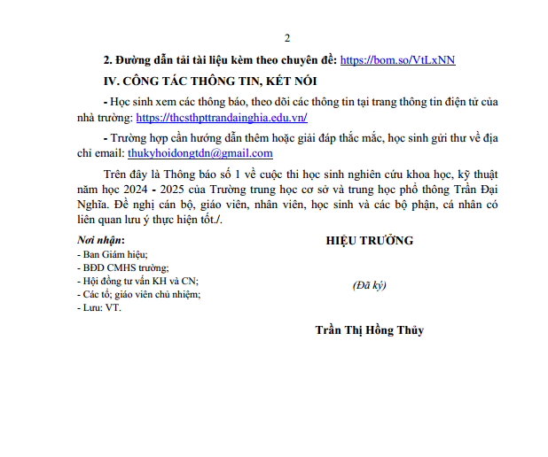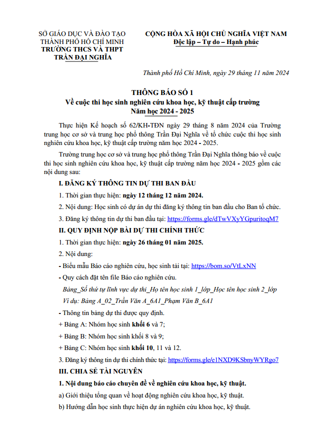 Thông báo số 1 về cuộc thi học sinh nghiên cứu khoa học, kỹ thuật cấp trường năm học 2024 - 2025